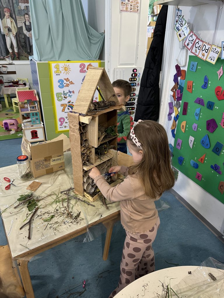 Djeca su s velikim zanimanjem i suradnjom uređivala drvenu kašetu, zabijajući čavle čekićem i spajajući drvene pregrade. Sljedećeg dana u unutrašnjost su slagala prikupljene materijale poput grančica, lišća i trave, stvarajući ugodan prostor za male stanovnike.